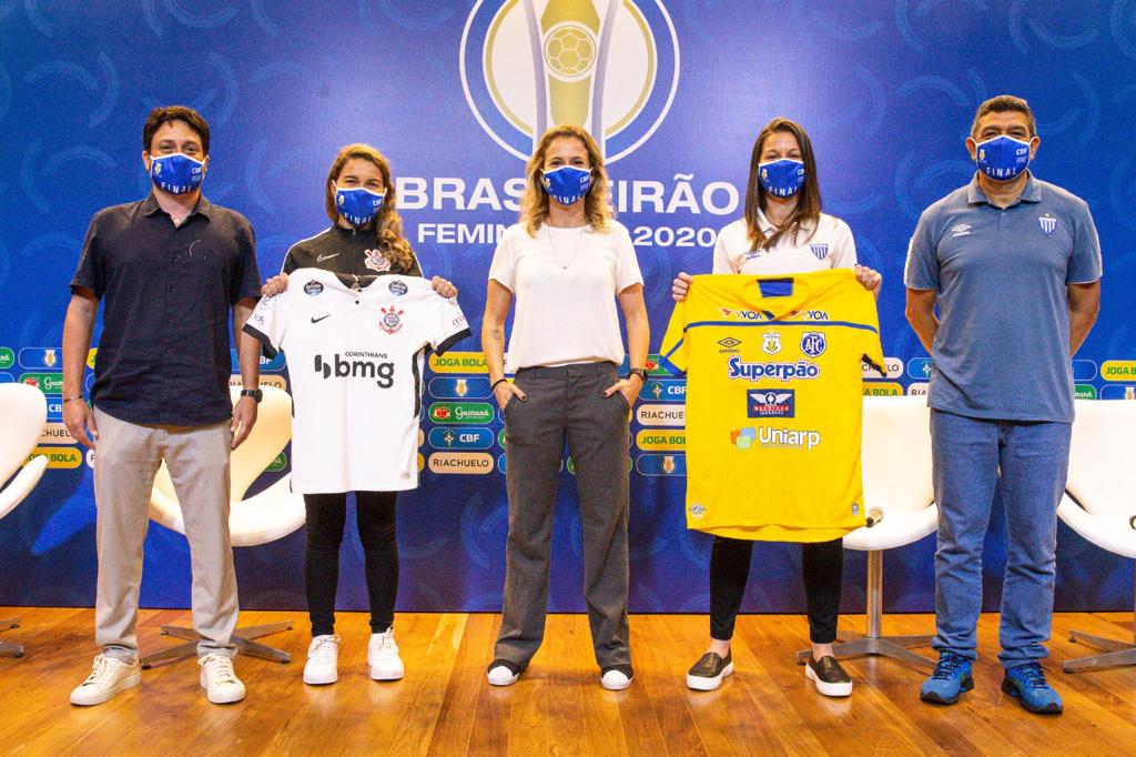 Técnico Jorge e capitã Tuani do Avaí/Kindermann no Media Day da CBF