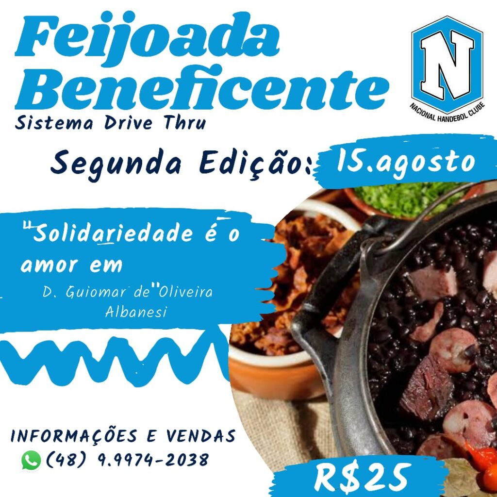 O Avaí / Handebol Nacional realiza neste sábado (15) a segunda edição de sua Feijoada Beneficente. Por conta da Pandemia do coronavírus, será no sistema Drive Thru. Quem quiser ajudar, poderá adquirir com antecedência, ao preço de R$ 25,00 e pagando no cartão. O telefone para contato é (48) 999742038, com Francisco Monteiro Neto, o […]