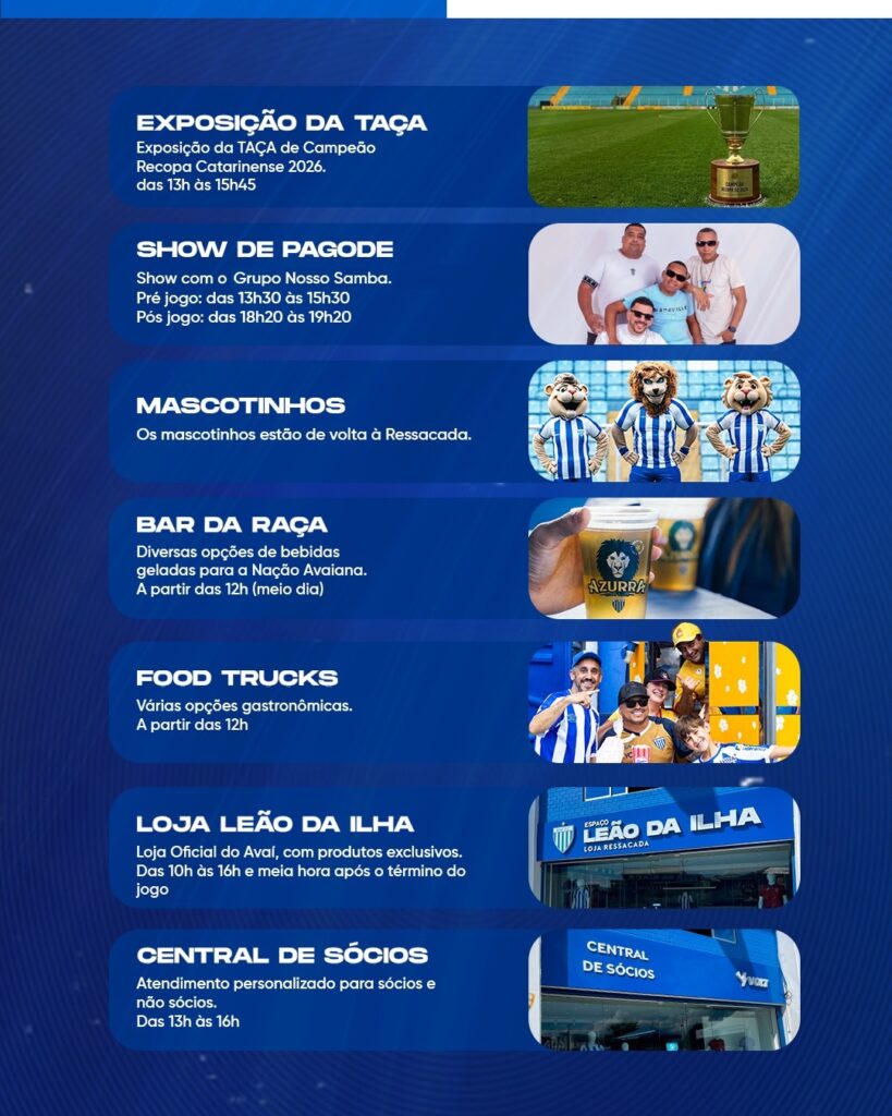 Confira abaixo a agenda de eventos que serão realizados neste domingo (22), quando o Avaí enfrenta, na Ressacada, o Juventude-RS, em partida válida pela 1ª rodada do Campeonato Brasileiro Série B 2026.